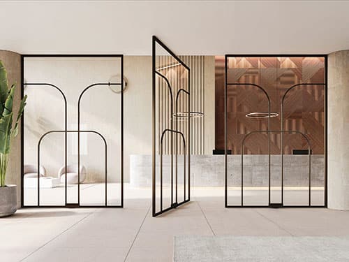 - Portes toute hauteur : Elles s’étirent du sol au plafond pour accentuer la verticalité et l’élégance des volumes.