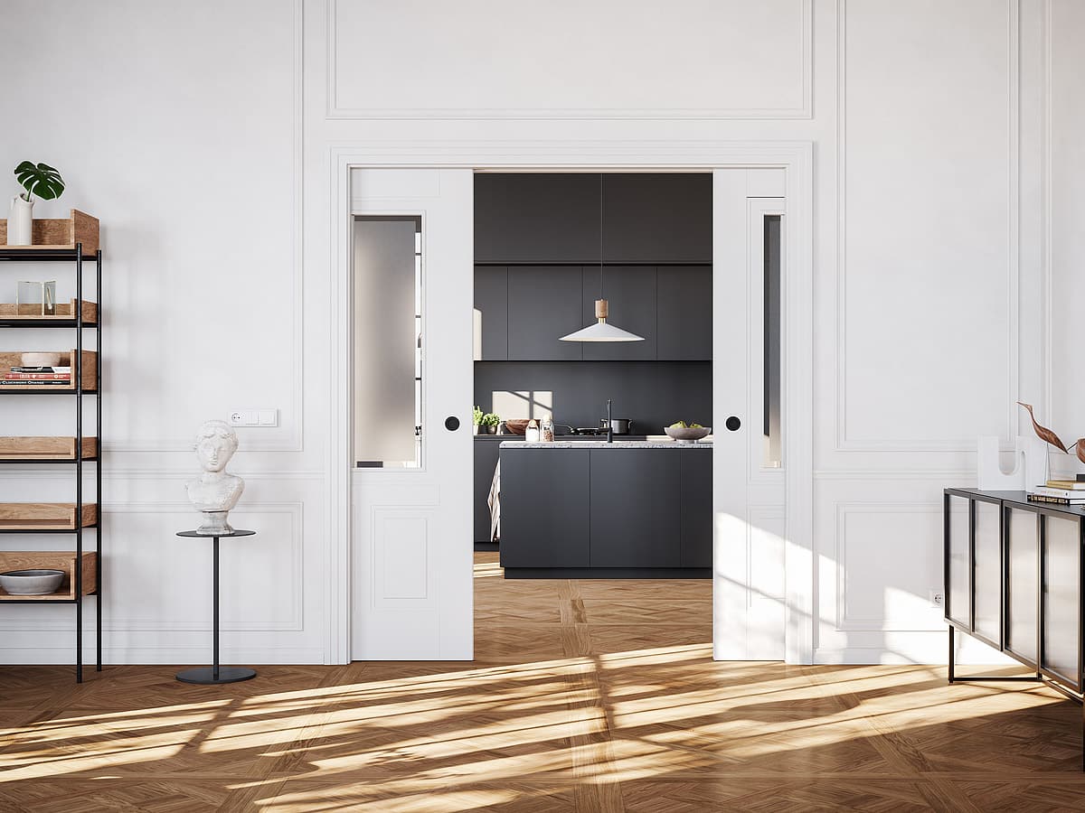 Pour les petits espaces ou pour créer une fluidité entre deux pièces (comme entre la cuisine et le salon), la porte coulissante à galandage est la reine incontestée. Contrairement à une coulissante classique qui glisse le long du mur (en applique), le système à galandage permet au vantail de disparaître littéralement à l’intérieur de la cloison.
